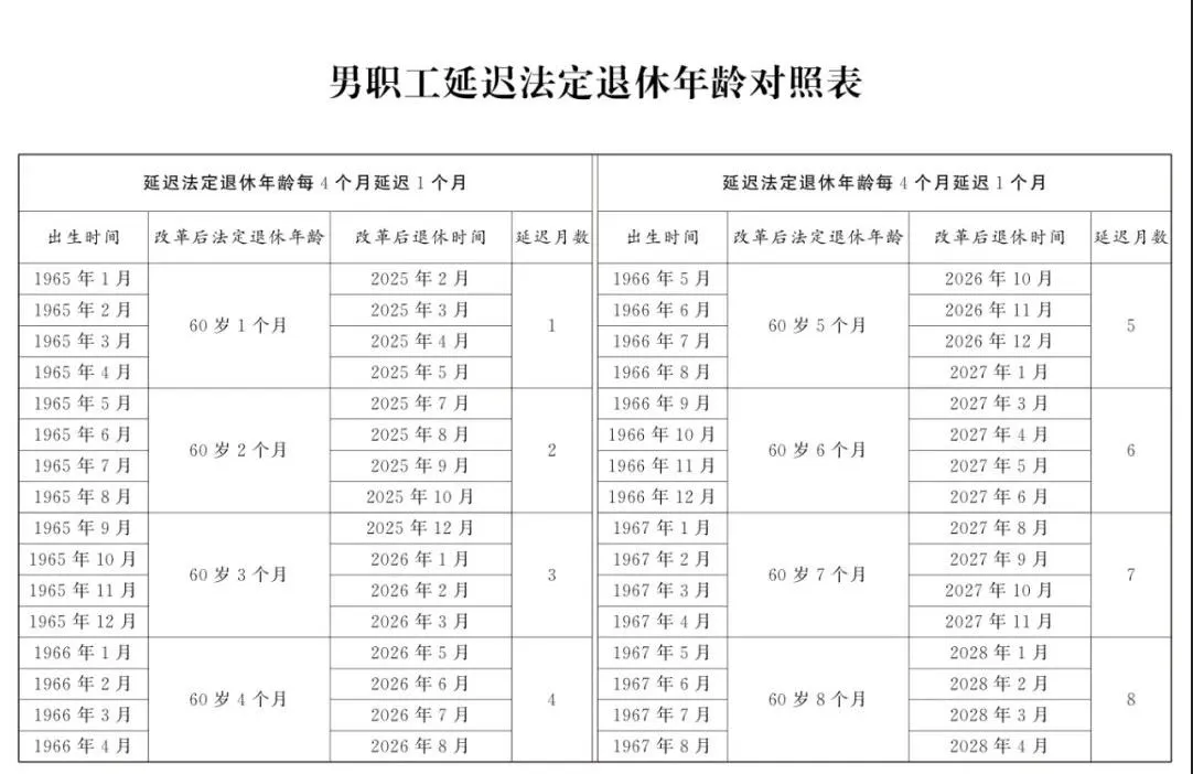 从2025年1月1日起,男职工法定退休年龄每四个月延迟一个月,逐步延迟至六十三周岁。